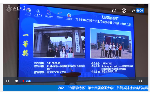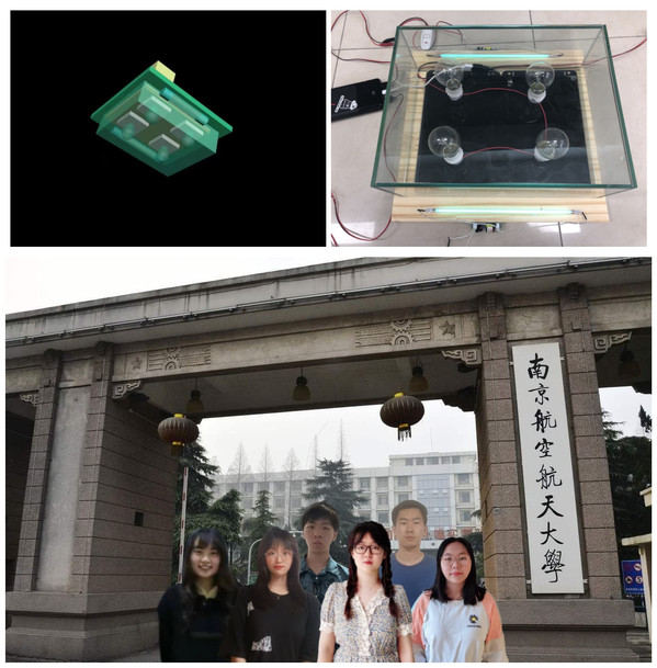 荣获一等奖的项目“灯启·明净-回收利用不可见光能源杀菌灯”由刘向雷、宣益民教授指导,团队由本科生伏蓉、杨一丁、王一搏、席玉茹、武筱迪、鱼滋惠组成。作品是一款不消耗额外电能产生紫外线的可杀菌灯,可以在不影响照明的前提下,既能净化空气,又达到节能减排的目的。灯泡外围采用可反射红外光,透过可见光的Low-E玻璃作为灯罩,达到在不影响照射的前提下让尽可能多的红外光照在太阳能板上,增加太阳能板的入射光强,将卤素灯发出的不可见光通过红外滤光薄膜片材料后被太阳能板收集并储存,提高整个灯的节能效率。
