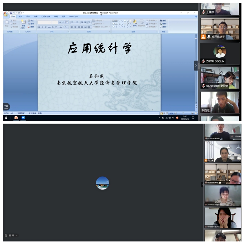 院长周德群在线进入20级管理科学与工程大类本科生《应用统计学》的线上课堂。吴和成老师已经在腾讯会议平台开始了课程导论的讲解。周德群参加了课堂的学习并借机对该课堂的老师和同学们表示慰问和关心,鼓励大家高效利用线上教学资源,积极消化课堂专业知识,在教学新形态下把知识学得更加扎实。
