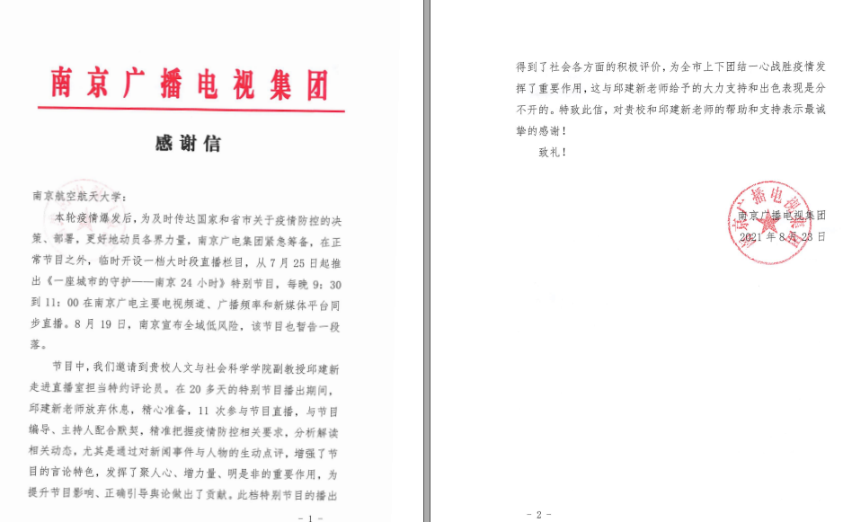 南京疫情爆发以来,人文学院师生积极配合学校及上级部门做好疫情防控相关工作,同时充分发挥专业优势,参与省市相关部门疫情防控舆论宣传、法律宣传及志愿服务等工作,为战胜疫情发挥了重要的作用。近日,南京广播电视集团向我校发来感谢信,对我校人文学院邱建新老师在抗疫工作中的帮助和支持表示了诚挚的感谢。