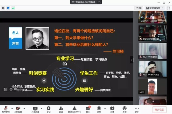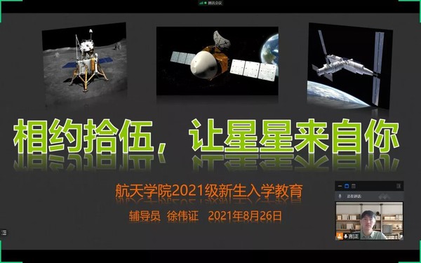 8月26日下午,航天学院2021级以“云相聚,线相遇”形式召开新生入学教育,本次活动主题是“相约拾伍,让星星来自你”,由辅导员徐伟证主持开展,5位优秀的本科生作为嘉宾、学院2021级全体新生加参加了此次线上年级会。