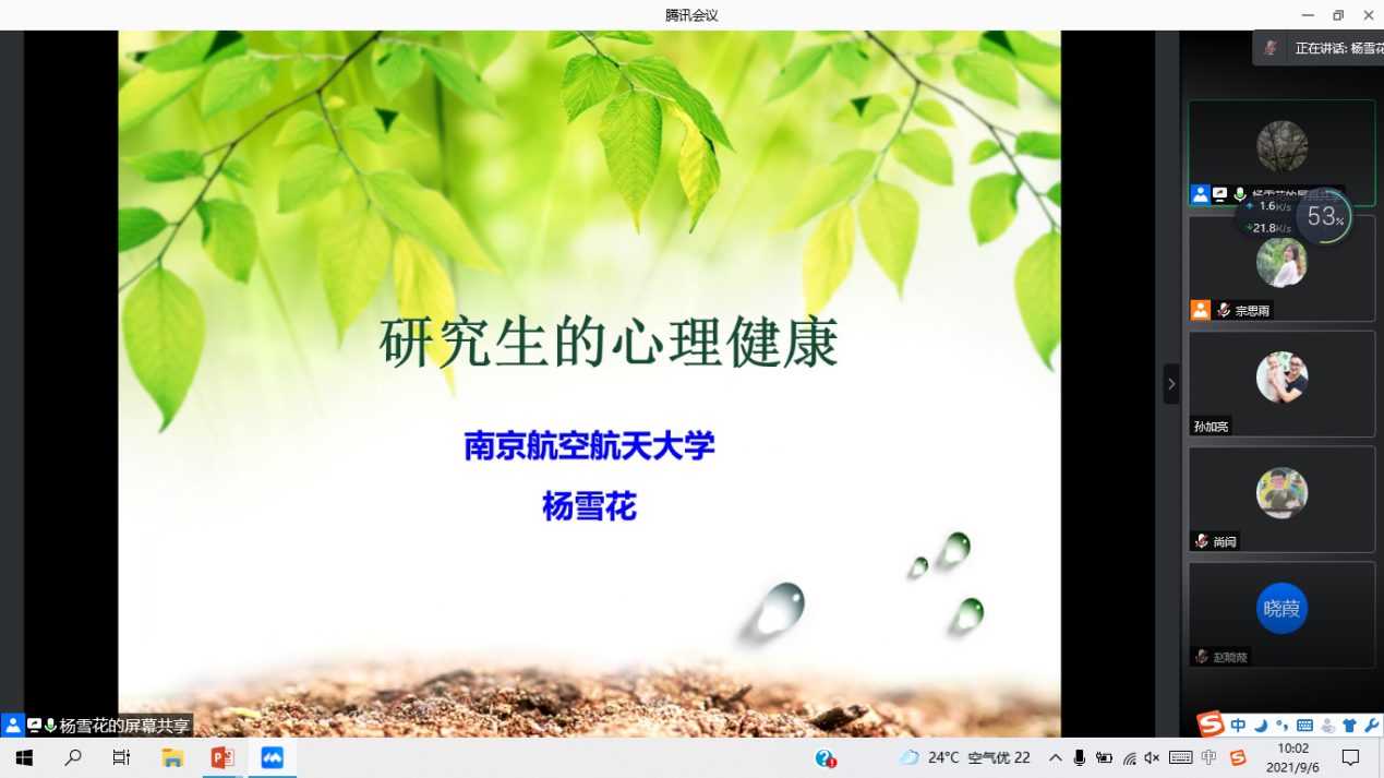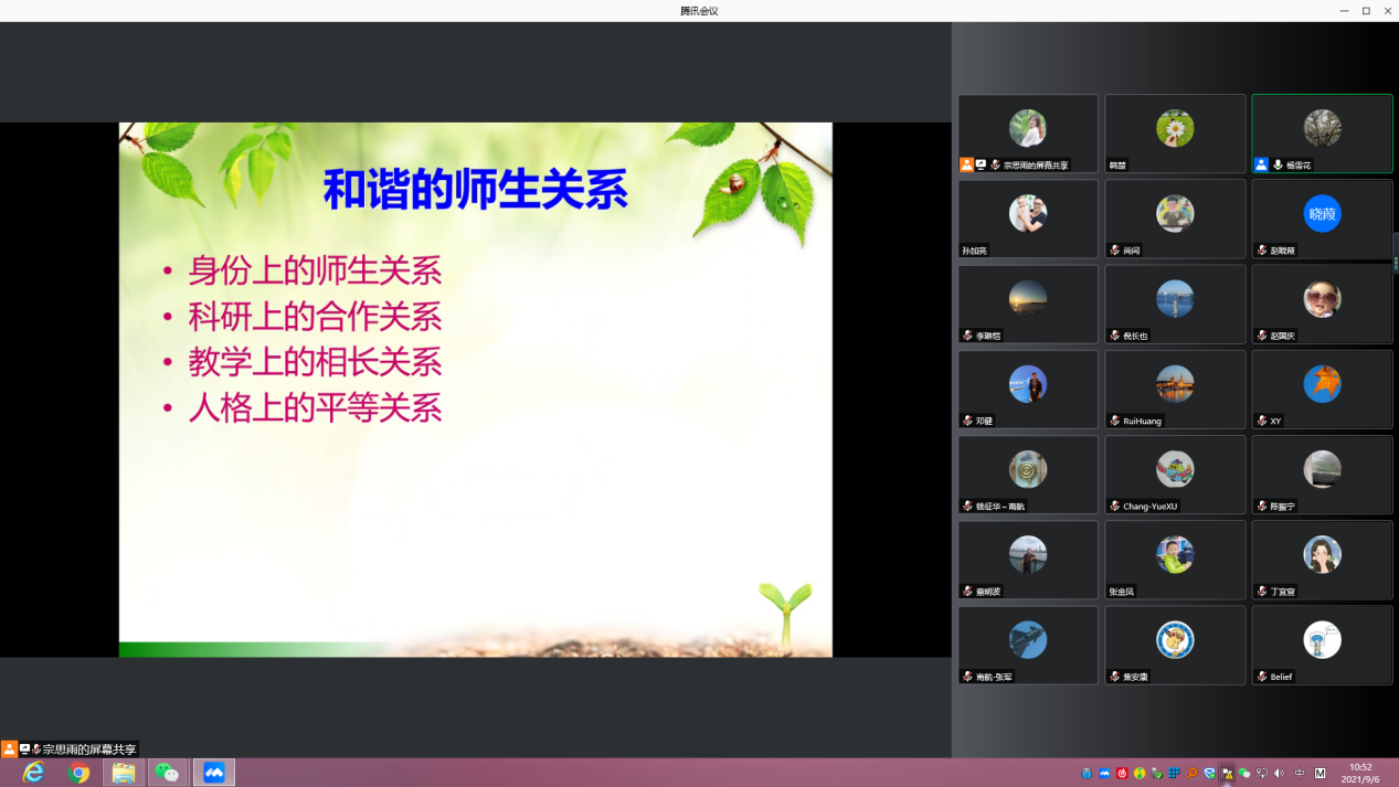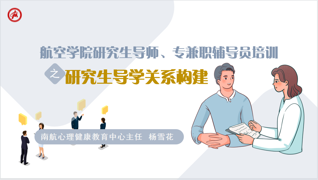 9月6日,航空学院研究生导师、专兼职辅导员培训于云端开展,我校心理健康教育中心主任杨雪花应邀面向学院研究生工作组、研究生新导师开展了主题为“研究生导学关系构建”的培训会。培训会由研究生辅导员宗思雨主持。