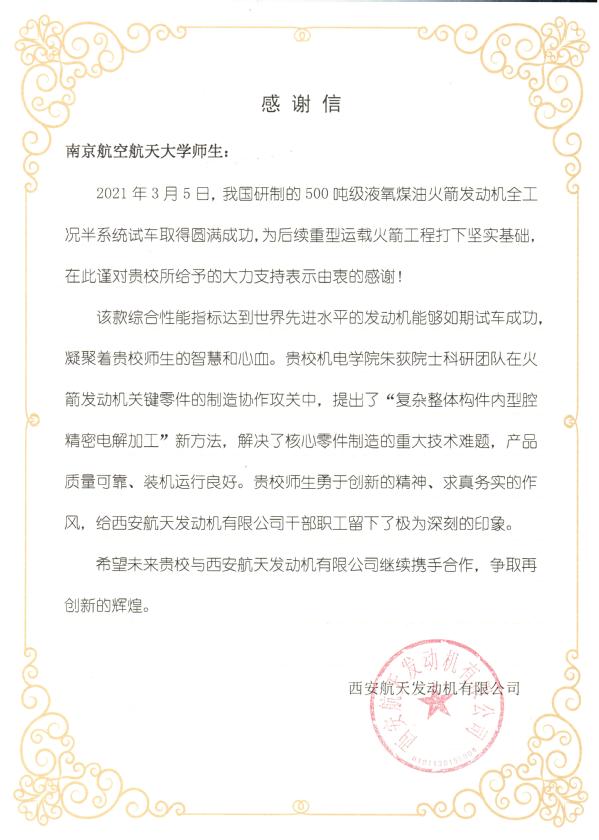 近日,西安航天发动机有限公司发来感谢信,感谢我校机电学院朱荻院士科研团队为我国500吨级液氧煤油火箭发动机的研制所给予的大力支持。