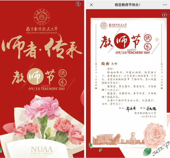 教师节来临前夕,三校区校园电子屏、校园广播、沿路横幅、食堂、各学院楼等循环播放教师节祝福等问候语,营造了浓郁的节日氛围。同时,学校倾情制作的2021南航师者形象片《微光》也在一早暖心发布,以入职10周年、20周年、30周年、退休等教师群体的故事为原型,集中展现我校立德树人的师者形象,刷屏南航“朋友圈”。