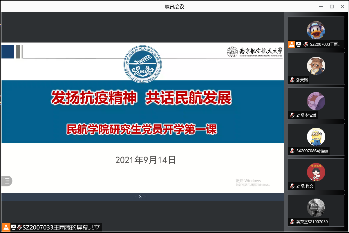 为传达学校疫情防控工作及相关要求,加强新老生的交流互动,同时帮助21级研究生新生形成对学院的认同感、归属感,尽快找准目标定位,走好“研途”,9月14日,民航学院党委书记刘建成为研究生党员作了题为《发扬抗疫精神 共话民航发展》的党课暨“开学第一课”。会议以线上形式召开,组织员侯美丽、组宣干事童肖、研究生辅导员及全体研究生党员和入党积极分子共200余人参加了会议。会议由学院20级研究生党支部书记王雨薇主持。
