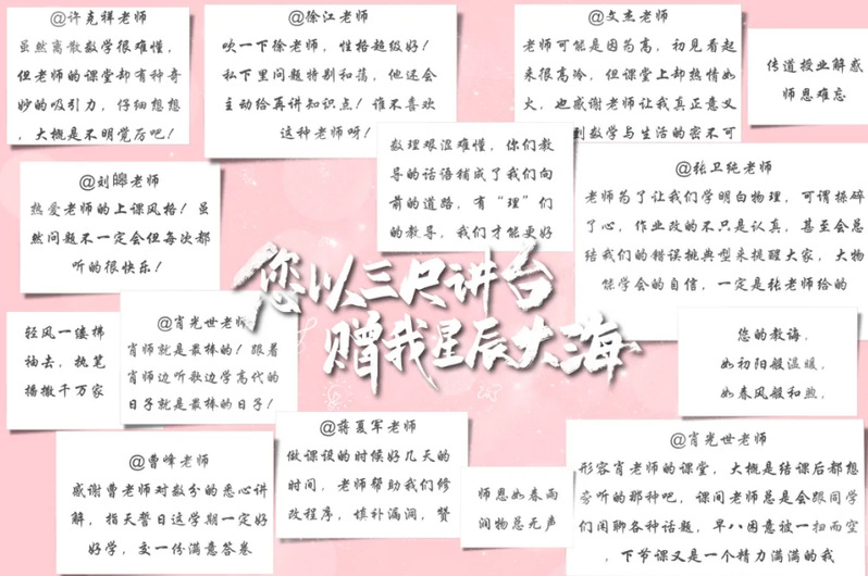 “热爱三尺讲台上的你,传道授业解惑也。你不知道我有多崇拜,诗词歌赋颂不完对你的爱”,同学们发挥自己的特长,改编并录制了歌曲《热爱三尺讲台上的你》,来表达对老师的敬重爱戴。言理工作室收集了同学们的点滴祝福制作成电子感恩墙送给老师。