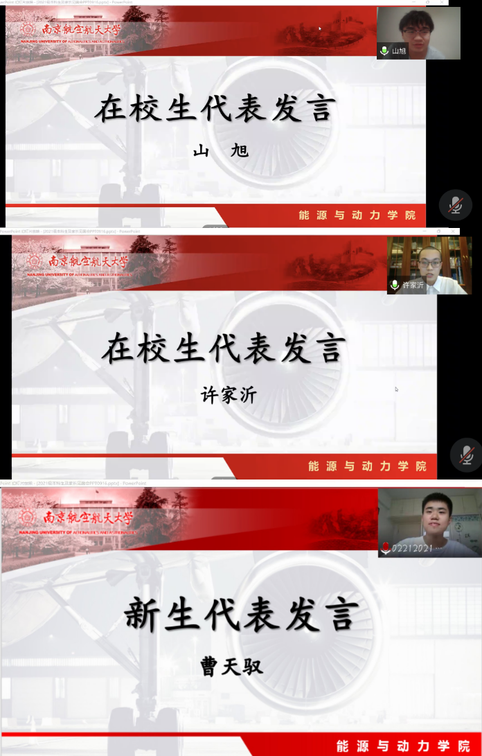 能源与动力工程专业硕士生山旭、车辆工程专业博士新生许家沂交流了各自在学院本科就读阶段的学习科创经历。曹天驭同学作为新生代表发言,讲述了一家航空三代人追逐蓝天的航空梦和投身航空领域的家国情怀,并表态一定会努力学习专业知识,将来投身航空发动机事业。