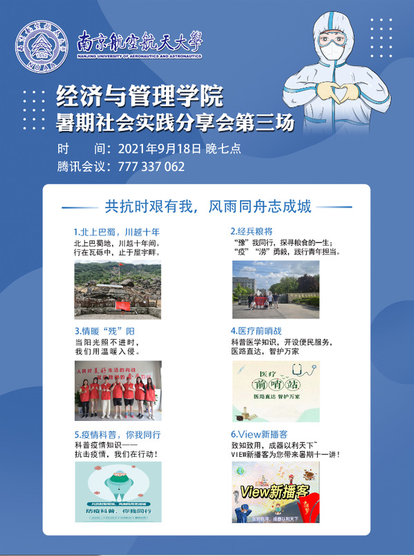 9月18日晚,经济与管理学院“共克时艰有我,风雨同舟志成城”暑期社会实践交流会第三场于线上腾讯会议顺利开展。来自经管学院的6支实践团队分享了他们的实践活动,讲述他们不同形式抗击疫情灾情的经历。他们将“共克时艰”放在心中,“众志成城”付诸行动,呈现出危难时刻、挺身而出的青年形象。经济与管理学院团委书记刘小杨及实践团队成员参加此次交流会。
