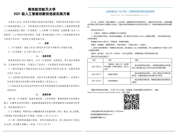 精心策划,制定线上选拔方案。由于疫情的影响,为保证选拔工作不受影响,保障“AI创新班”生源质量,结合“AI创新班”人才培养的目标和要求,学院高度重视、及时调整,制定《2021级人工智能创新班的选拔方案》,发布《2021级人工智能创新班面试选拔细则》与《网络远程面试指南》,与学生在线签署网络面试承诺,指导学生测试面试网络环境等,确保在线面试环节有序开展。