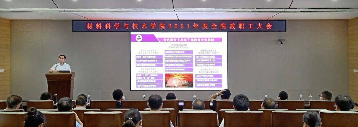 9月29日下午,在喜迎72周年国庆前夕,材料科学与技术学院召开新学期全体教职工大会,深入学习习近平总书记“七一”重要讲话精神和中央人才工作会议精神,贯彻落实学校2021年度下半年干部教师大会精神,解读学科评估指标与学院绩效考核指标体系,进一步明确下一阶段学院重点推进工作。会议由学院党委书记石勇主持,学院领导班子全体成员、全体教职工参加了本次会议。