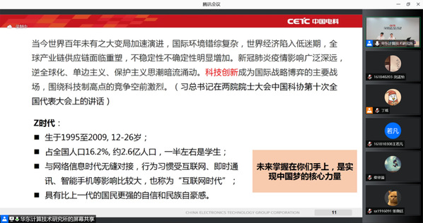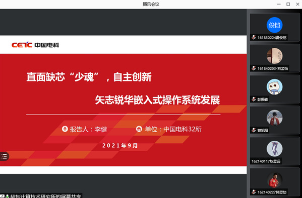 9月30日晚,计算机科学与技术学院/人工智能学院“石榴国防大讲堂”云端开讲。本次活动邀请中国电子科技集团公司第三十二研究所基础软件部主任李健和人力资源部青年骨干马睿骁为同学们带来题为“直面缺芯‘少魂’,自主创新矢志锐华嵌入式操作系统发展”的主题讲座,吸引学院120余名本科生和研究生参加,讲座由2018级本科生辅导员丁瑶主持。
