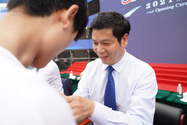 全体校领导和嘉宾为2021级本科新生代表佩戴南航校徽,台下全体新生共同佩戴校徽,宣告自己成为了一名真正的南航人。郭万林院士等7名教师代表通过视频寄语新生,鼓励他们心怀国之大者,争做国之大才,成长为德智体美劳全面发展的社会主义建设者和接班人。