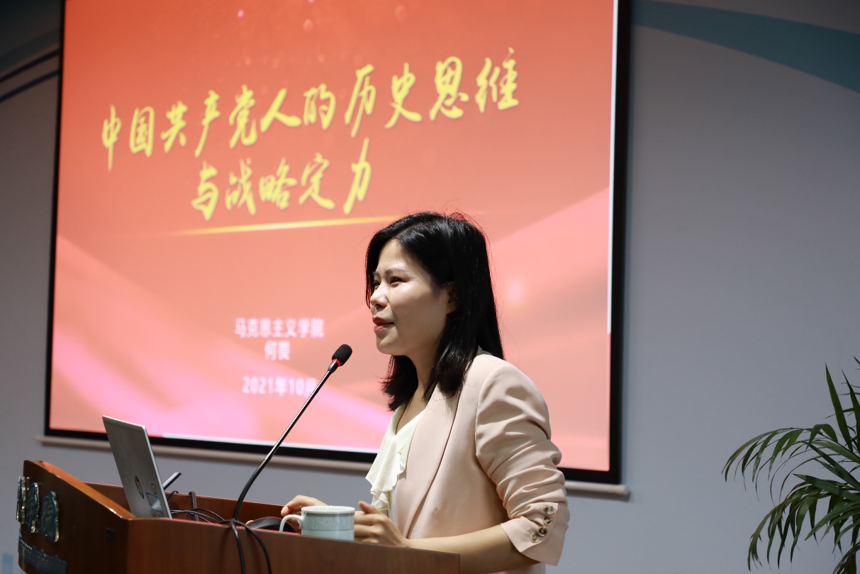 何畏教授结合自身的成长经历、专业领域研究和工作实践体会,从“中国共产党为什么能”、“中国特色社会主义为什么好”、“归根到底是因为马克思主义行”,为大家做了一场生动和富有感染力的宣讲。她从历史的本体论思维、历史的过程性思维和历史的目的性思维三方面,简要阐述了什么是历史思维;中国共产党正是坚持历史思维,在民族伟大复兴的历史坐标中定位初心使命、在践行初心使命的接续奋斗中保持战略定力、在实现共同理想的奋力拼搏中追求最高理想,才有了今天100年的辉煌和中国特色的社会主义。