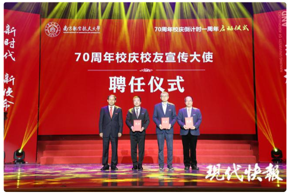 10月20日,南京航空航天大学70周年校庆倒计时一周年启动仪式在明故宫校区大学生活动中心举行。活动现场发布《南京航空航天大学 70 周年校庆 1 号公告》,举行校友宣传大使聘任仪式,聘请了“鲲龙”AG600 总设计师黄领才、国家重点直升机型号总设计师邓景辉、2020 年度“杰出工程师”吴云坤担任校友宣传大使。