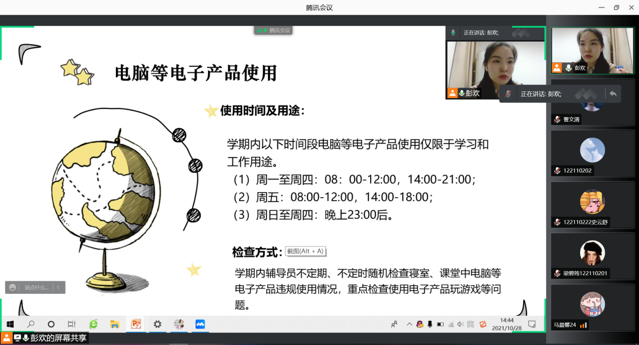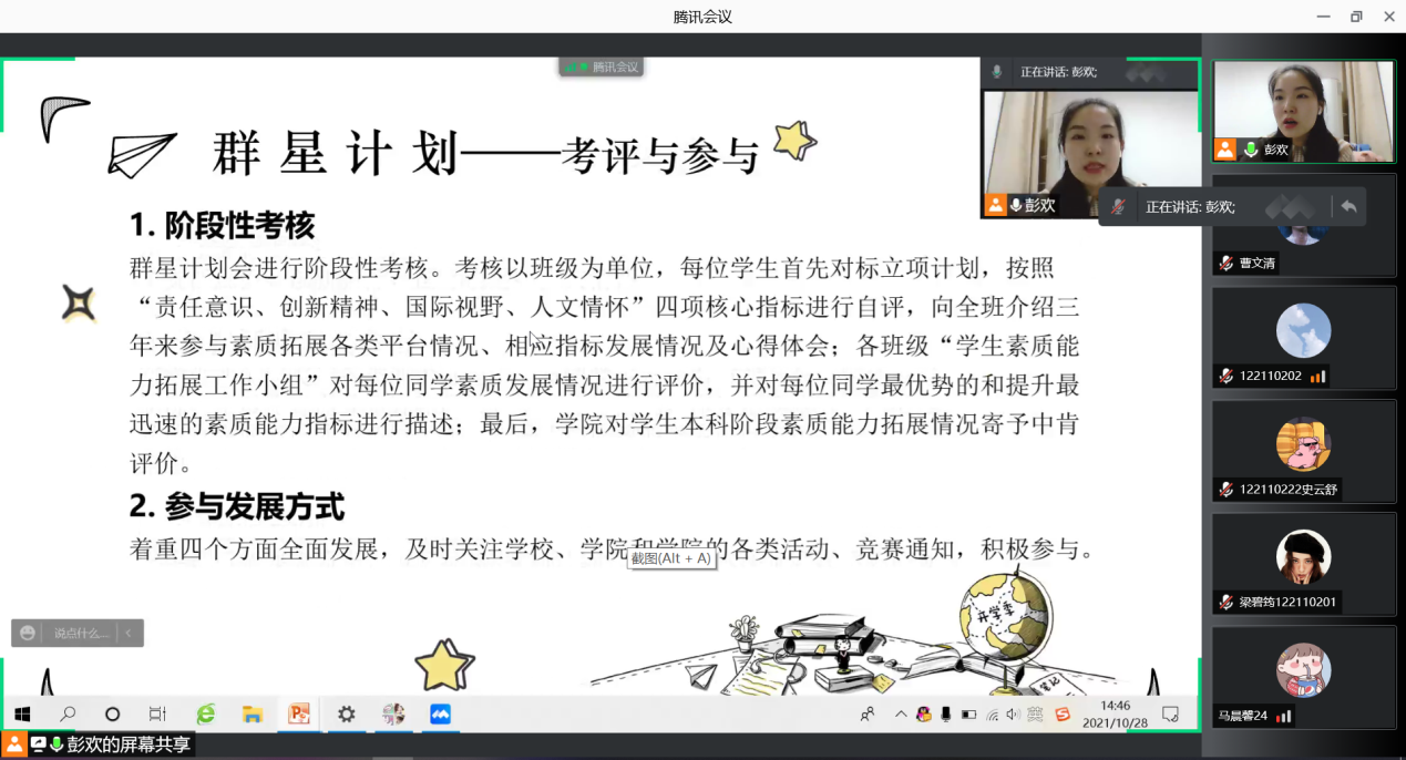 为了增进大一新生对校院制度及“群星计划”学生素质拓展平台的了解,更好地帮助新生们适应大学生活, 10月28日下午,外国语学院在线上腾讯会议平台召开了2021级本科新生“群星计划”主题年级会。2021级本科生辅导员彭欢、兼职F辅导员曹文清,2021级全体新生参加会议,会议由彭欢主持。