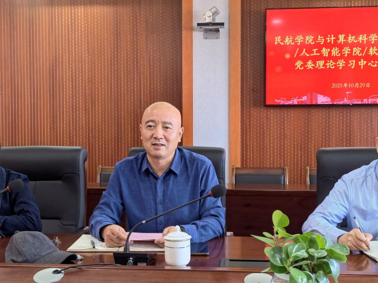 为深入落实校党委党史学习教育工作部署,推动理论学习联系工作实际,促进院级党组织相互学习和交流,10月29日,民航学院党委和计算机科学与技术学院/人工智能学院/软件学院党委理论学习中心组在民航学院1213会议室,围绕“学习习近平总书记给全国高校黄大年式教师团队代表的回信精神”、“学习王泽山、刘永坦等工信楷模的先进事迹”两个专题展开联合学习,双方就两学院学科交叉融合发展设想作重点发言。会议由民航学院党委书记刘建成和计算机学院党委书记刘健荣共同主持,双方党政领导班子全体成员、党委委员、党政办主任参加了学习。