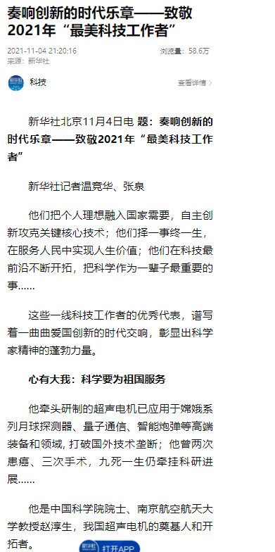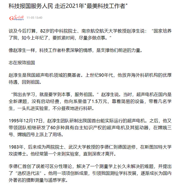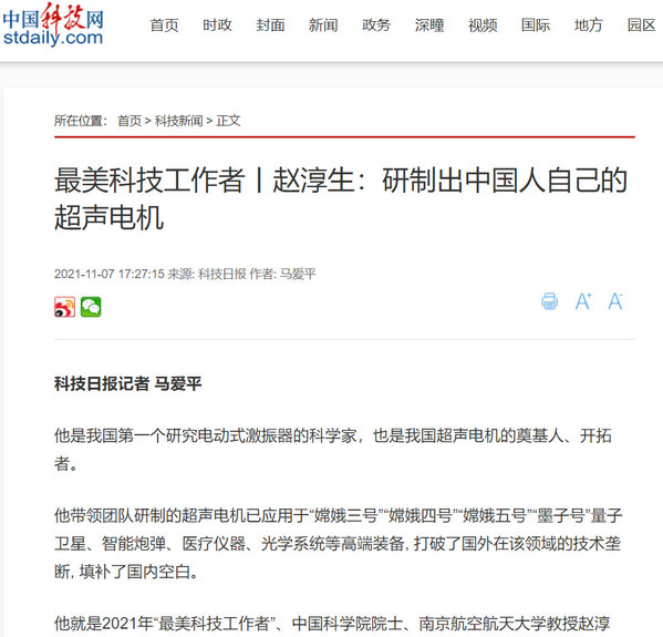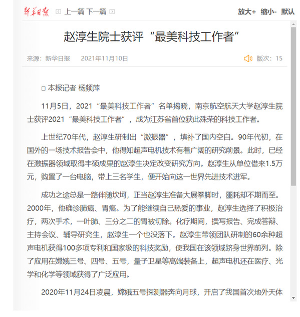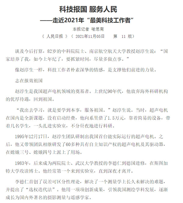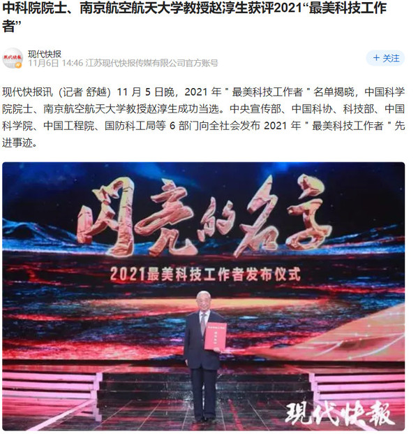 现代快报丨中科院院士、南京航空航天大学教授赵淳生获评2021“最美科技工作者”