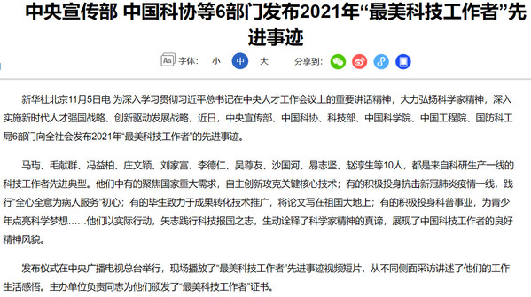 新华网丨中央宣传部 中国科协等6部门发布2021年“最美科技工作者”先进事迹