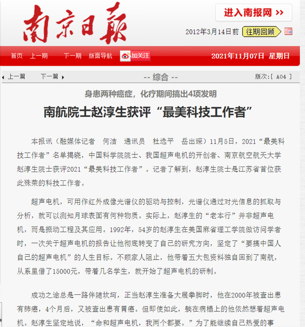 南京日报 | 身患两种癌症,化疗期间搞出4项发明南航院士赵淳生获评“最美科技工作者”