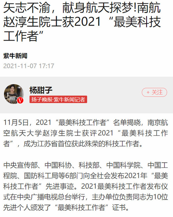扬子晚报紫牛新闻丨矢志不渝,献身航天探梦!南航赵淳生院士获2021“最美科技工作者”