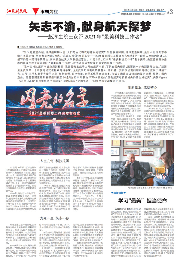 江苏科技报丨矢志不渝,献身航天探梦——赵淳生院士获评2021年“最美科技工作者”