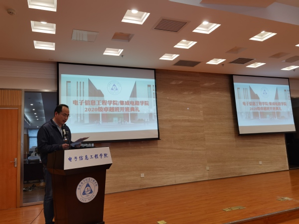 11月4日,电子信息工程学院/集成电路学院2020级本科生卓越工程师班开班典礼在学院515报告厅顺利举行,院长助理牛臻弋、电子科学与技术系系主任刘冰、系副主任王毅、信息与通信工程系系主任夏伟杰、实践教育中心副主任邱旦峰、2020级卓越班班主任胡志忠、朱秋明、企业代表中兴通讯股份有限公司行业总工张慧、南京华成微波技术有限公司总经理任波等出席典礼,2020级全体卓越班学生参加典礼。典礼由牛臻弋主持。