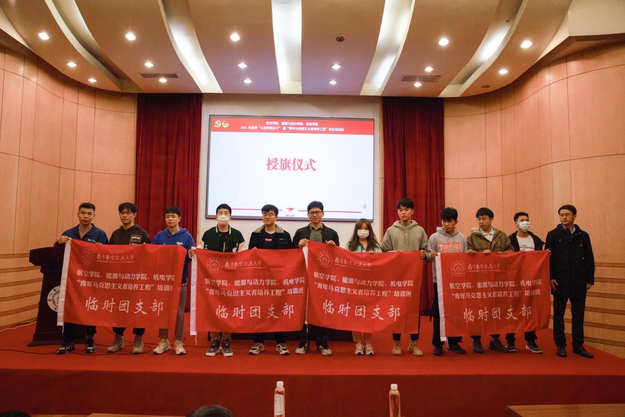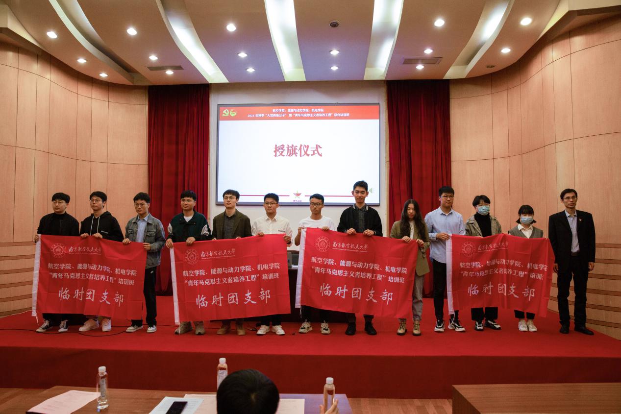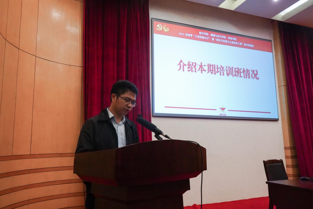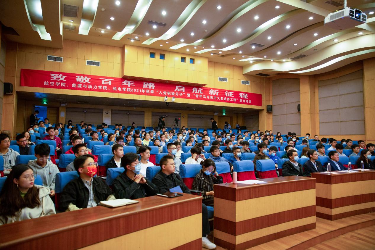 为深入开展党史学习教育,认真学习贯彻习近平总书记在庆祝中国共产党成立100周年大会上的重要讲话精神,11月6日上午,航空学院、能源与动力学院、机电学院联合举办的2021 年秋季入党积极分子暨青年马克思主义者培养工程(简称“青马工程”)联合培训在明故宫校区逸夫报告厅顺利开展。航空学院党委书记袁智强,能源与动力学院党委书记王中叶,机电学院党委书记刘虎,学生处副处长王霄,校团委副书记、机电学院党委副书记董羽,各学院组织员、团委书记、辅导员老师以及本期培训班部分成员出席了本次活动。开班仪式由航空学院党委副书记佘明主持。