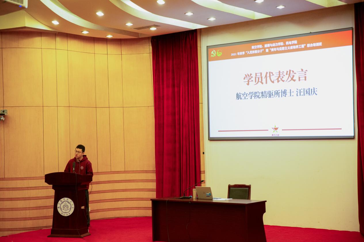 随后,航空学院汪国庆博士作为学员代表分享了他在2021年互联网+大赛中获得国奖的经验与感受,并向大家提出认真完成本次学习任务的号召,将培训所得化为日后学习科研的动力。