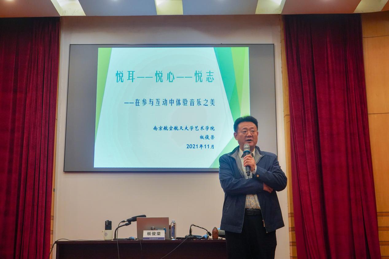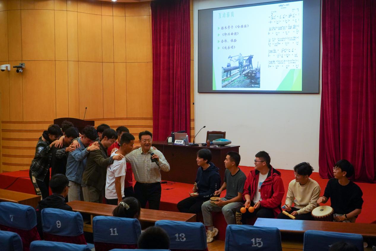 培训日下午,艺术学院院长板俊荣继续带来精彩讲授,他以《悦耳——悦心——悦志(基于实践,践行美育)》为主题,通过丰富的视频资料、稀奇罕见的小乐器、有趣的模仿动作,以多种多样的形式充分调动同学们参与,鼓励同学们以“主动体验”的方式体会音乐的乐趣所在,现场热烈气氛达到高潮。