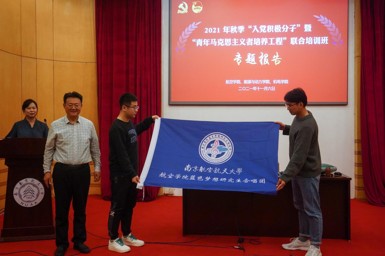 为了丰富我们本部研究生校园文化生活,进一步提高研究生文化素质,给同学们提供一个展示自我、锻炼自我的平台,航空学院正式成立蓝色梦想合唱团。一场艺术之旅结束后,板俊荣为航空学院研究生合唱团授旗,佘明为合唱团指导教师、航空学院兼职辅导员王莉丽颁发了证书。