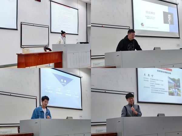 周博士本次主要就英美新港留学项目进行讲解。“出国不是极其困难的事,现在开始学习语言,一点都不迟。”对于南航机电学院的学生来讲,国外各高校对绩点要求不高,在经济条件充足的情况下,出国无疑也是一种很好的选择。成功推免至华中科技大学的李新顺学长进行了“保研,大三应该做什么”的主题分享,从基本绩点要求,竞赛加分,各校招生指标,面试技巧等方面与学弟学妹们进行了深入探讨。以综合成绩第一名成功考研的王恩宁学长从自身出发,给大家从笔试到面试,从考试科目到准备时间都进行了充分的剖析,尤其提到选择导师是很重要的一环。最后王恩宁学长以“谨慎思考,坚定选择,脚踏实地,持之以恒”作为经验寄语送给在座的同学们。