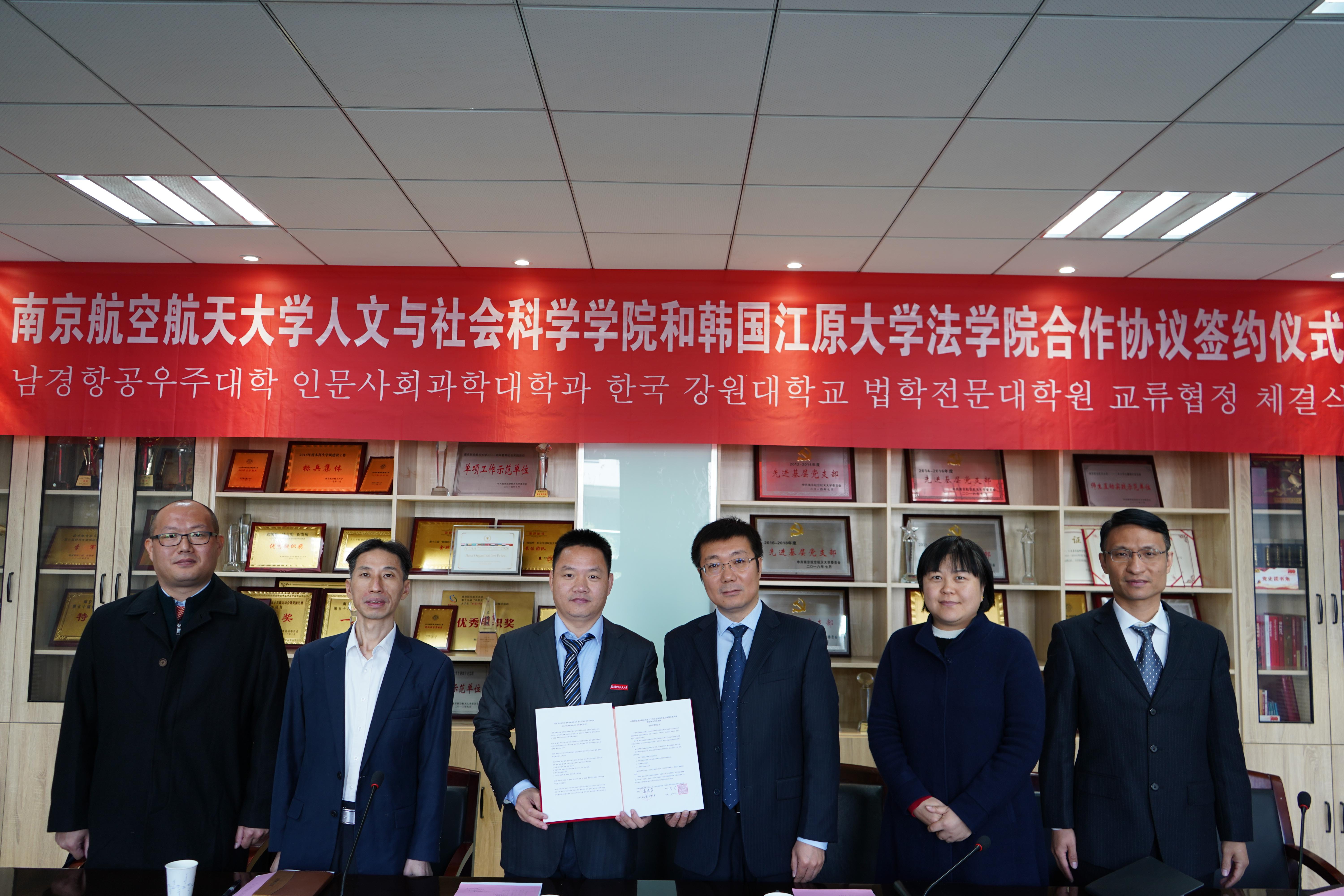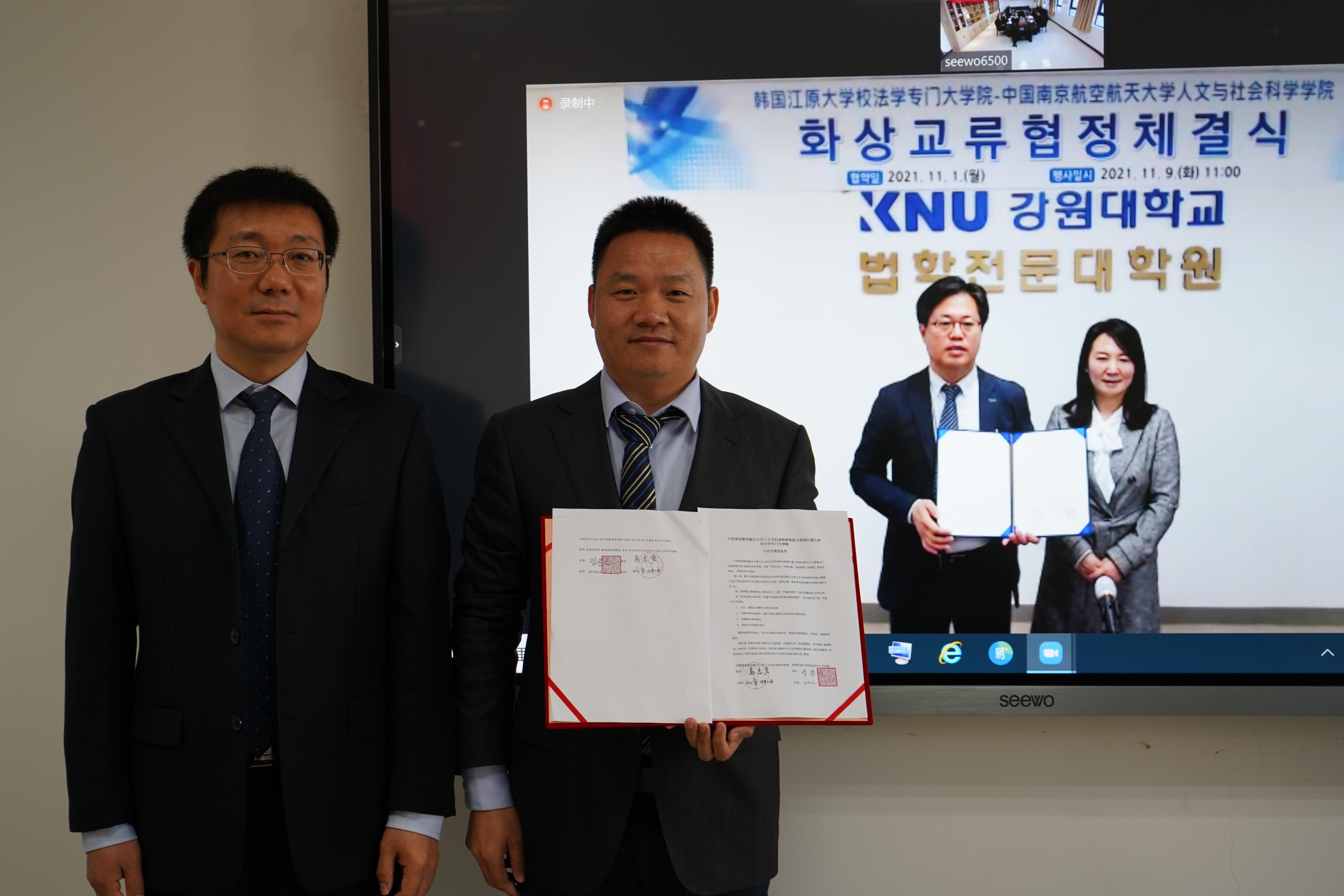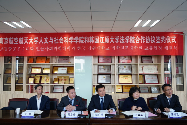 随后,高志宏与郑镇根共同签署了南京航空航天大学人文与社会科学学院与韩国江原大学法学院交流合作协议。