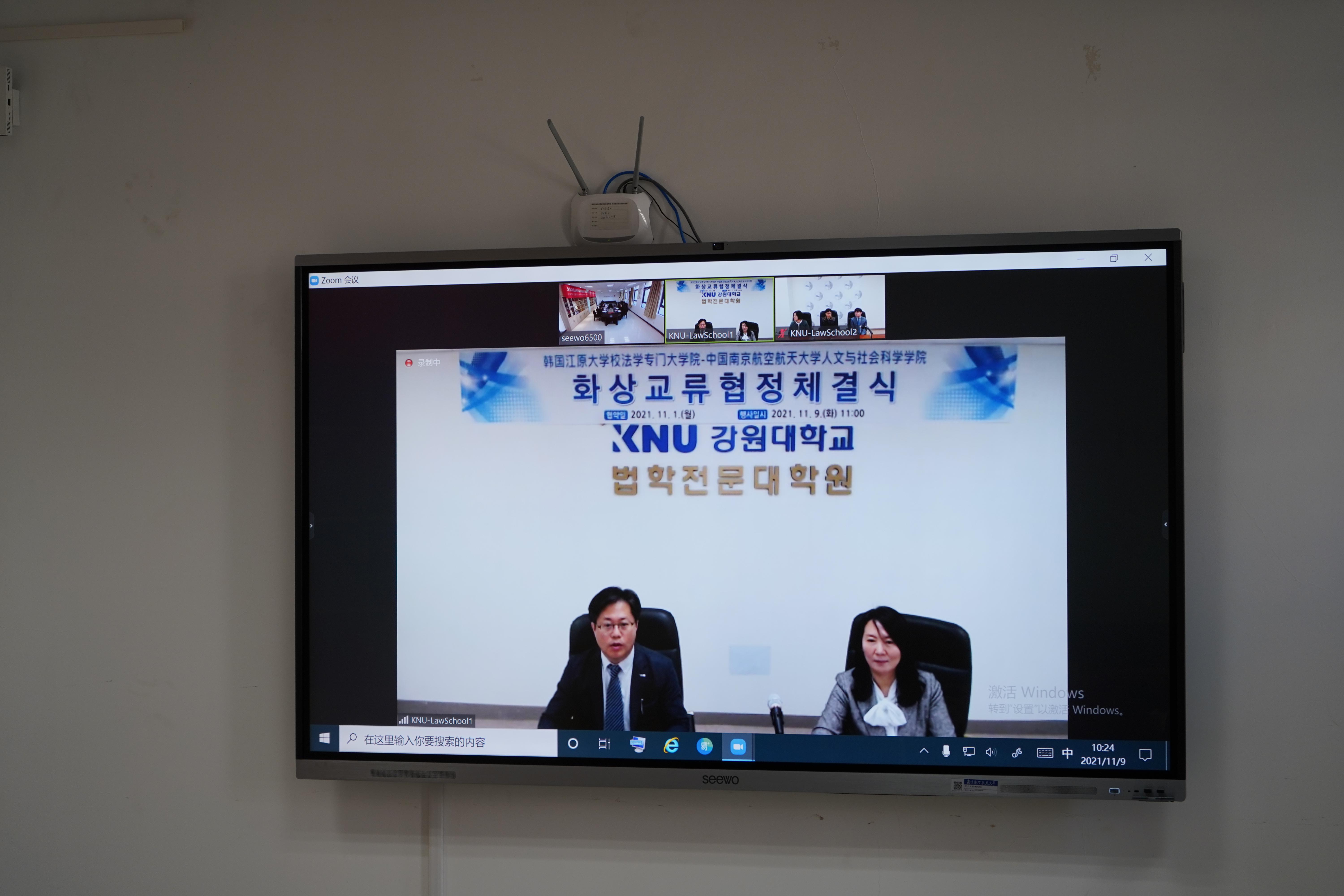11月9日上午,我校人文与社会科学学院与韩国江原大学法学院召开视频会议,双方就合作交流事宜举行了线上签约仪式。人文与社会科学学院党委书记楚广兴、院长高志宏、党委副书记尹春苹、副院长茅晓嵩、法律系教授王炳、副教授孙汉基代表学院出席了会议。韩国江原大学法学院院长郑镇根、副院长李玧政、教授会会长朴泰炫以及赵诚子、李珍守教授代表江原大学法学院出席了会议。