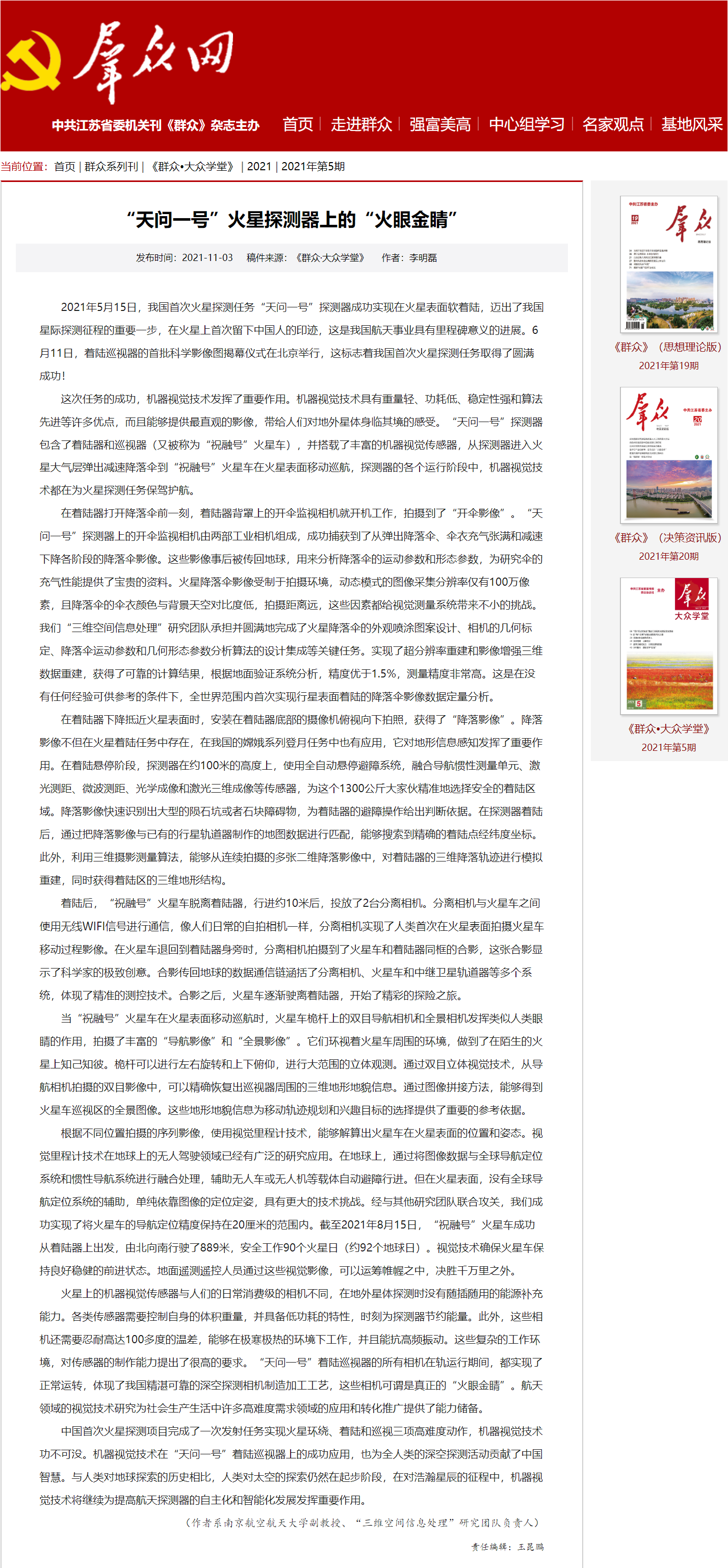 2021年11月03日,中共江苏省委机关刊《群众·大众学堂》(2021年第5期)刊载了我校电子信息工程学院李明磊副教授的署名文章《“天问一号”火星探测器上的“火眼金睛”》。《群众》杂志是中共江苏省委主办的政治理论刊物,于1937年创刊,由中共中央和周恩来、董必武等直接领导。之后在历届中共江苏省委的领导下,《群众》杂志大力宣传马克思主义中国化最新成果,宣传中央的重大战略思想和省委的决策部署,为提高全省党员干部的思想理论水平,推动党的路线、方针、政策的贯彻落实发挥了重要作用。