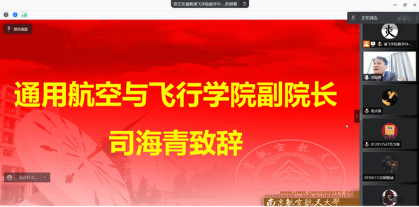11月9日中午,2020级飞行技术卓越工程师班开班典礼在线上举行。艾维国际飞行学院执行董事徐波、市场部经理高楠、教员杜伟华,学校教务处副处长朱建军、通用航空与飞行学院(下文简称通飞学院)党委副书记魏慧冬、副院长司海青以及2020级全体卓越班新生出席开班典礼仪式。仪式由通飞学院飞行技术系主任高振兴主持。
