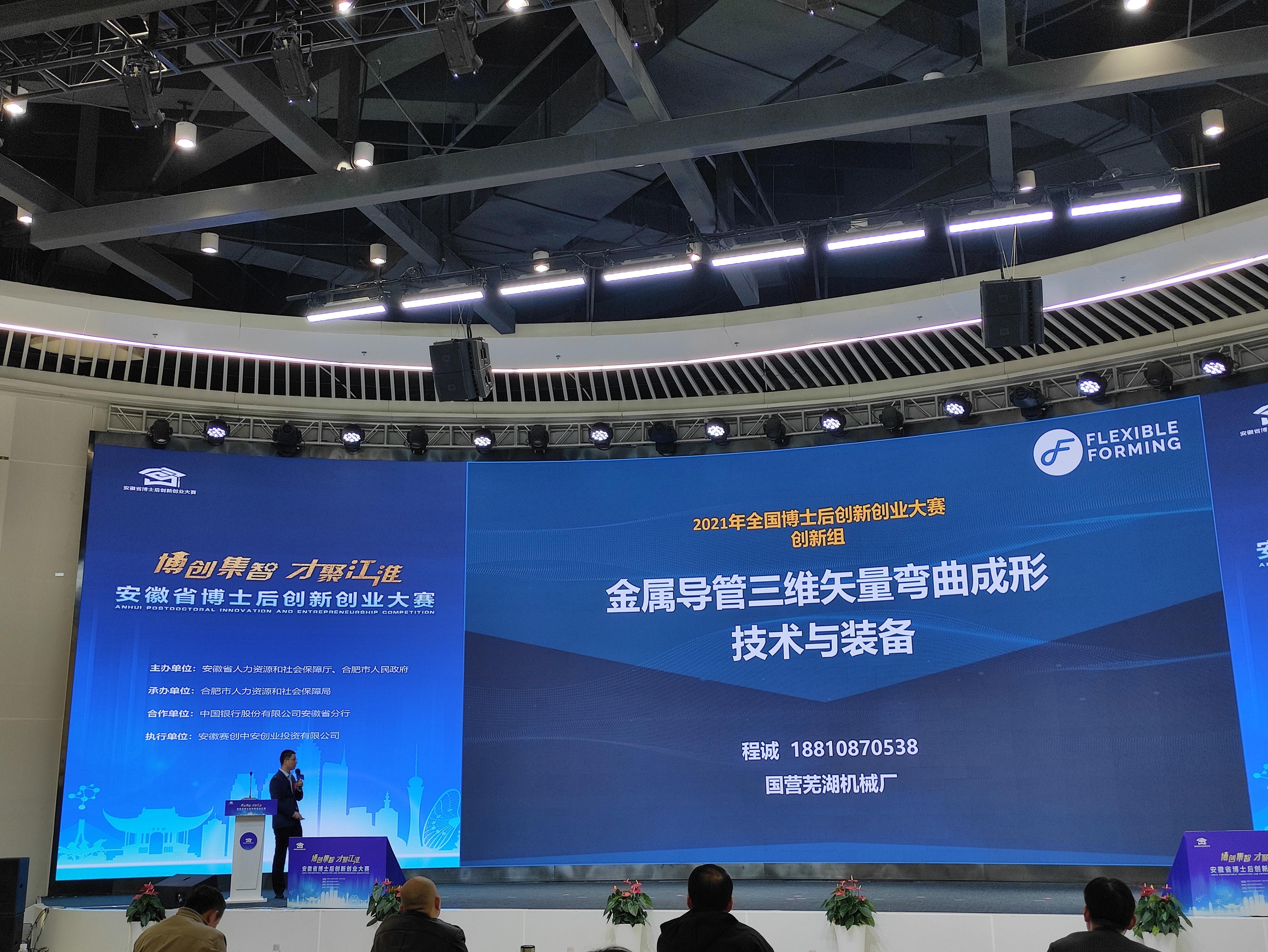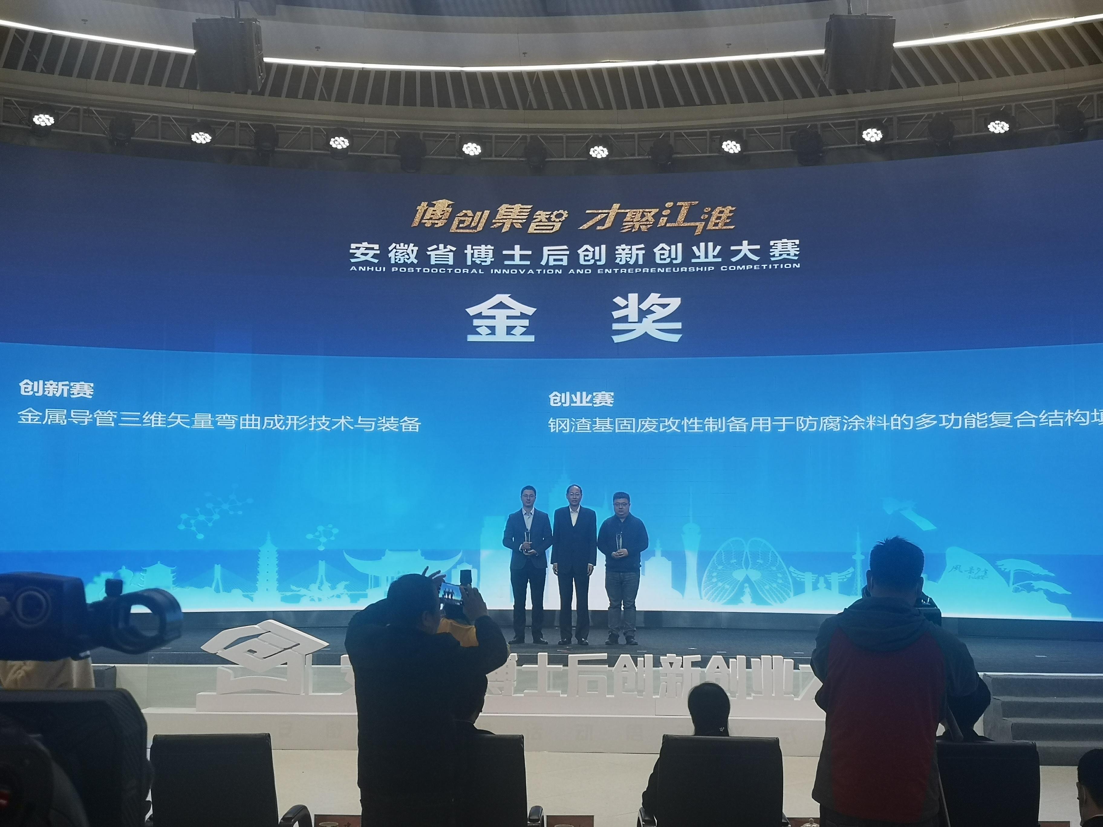 此次全国博士后创新创业大赛,是人社部首次举办的全国性博士后创新创业赛事。安徽赛区共有43个项目入围决赛,设金奖2名、银奖4名、铜奖10名。材料学院的程诚博士后的“金属导管三维矢量弯曲成形技术与装备”,以第一名的好成绩获得创新组金奖。