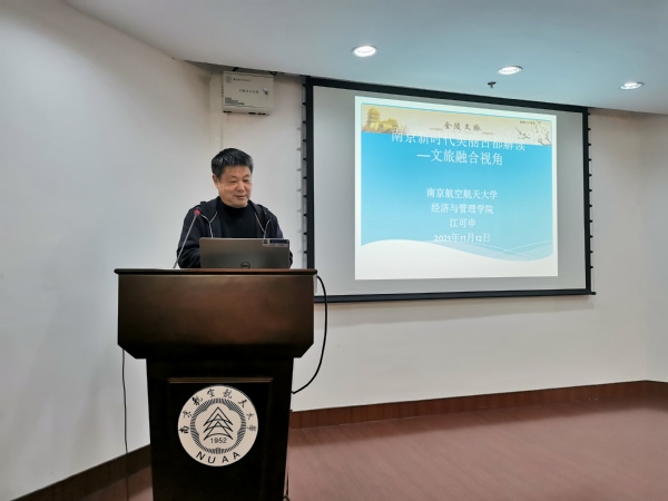 江可申深入学习贯彻习近平总书记关于宣传思想文化工作的重要思想,以《南京新时代美丽古都解读》为题,从文旅融合视角,结合马克思主义价值理论,全面解读南京作为新时代古都所具有的历史文化资源的效用价值。他指出,将一个城市的历史进程写进经济学的思维框架,揭示其主观效用论的历史特征;将其资源禀赋的独特性向城市旅游业引领,彰显城市影响力和市场竞争力的优势所在。文旅融合可以激发社会发展动力和创造力,促进地方经济飞速发展。