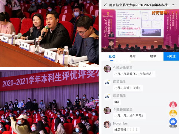 在今年校长特别嘉奖公开答辩现场我们邀请到了我校民航学院2021届毕业生、2019-2020学年南航广播台台长,2019-2020学年校长特别嘉奖得主刘畅担任主持,体现传承。此外,院士、知名教授、学院领导、任课教师、班主任、科创项目指导教师、企业代表、媒体代表、政府工作人员、志愿活动受助单位代表等作为推荐人参与到我们的公开答辩活动中,他们从不同角度对候选同学取得的优异成绩表示肯定、进行推荐,并激励同学们奋发进取、再创佳绩,彰显育人合力。