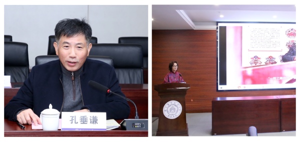 我校艺术教育中心主任、南京剪纸传承基地负责人杨莉莉教授就基地建设和公共艺术课程落实情况做了详细汇报,回顾了传承基地建设历程,汇报了优秀传统文化传播和辐射带动工作,展示了南京剪纸工作坊的建设成果,并介绍了我校公共艺术教育的师资队伍与课程设置。