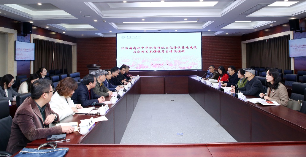 11月15日, 省教育厅二级巡视员李金泉、体卫艺处副处长王红蕾及专家组一行来到将军路校区,对我校中华优秀传统文化传承基地建设和公共艺术课程落实情况进行调研考核。我校党委副书记刘宇雷,兼职教授、南京剪纸国家级传承人张方林,兼职教授、无锡精微绣国家级传承人赵红育,著名京剧表演艺术家范以程等出席调研座谈会。教务处处长孔垂谦主持会议。
