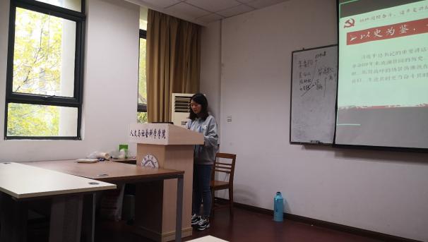 首先,陈佳瑶分享了主题为“秉承先驱遗志,共筑复兴伟业”——习近平总书记在纪念辛亥革命110周年大会上讲话的学习心得。她从铭记先驱功勋,汲取奋进力量;秉承先驱遗志,共担历史使命;始终团结奋斗,迈步复兴征程三方面介绍学习成果。她向大家介绍了辛亥革命的重要性,回顾了孙中山先生等先辈们的伟大历史贡献,表明了传承辛亥革命精神的决心,最后强调总书记的深切叮咛:我们要以史为鉴、开创未来,在全面建设社会主义现代化国家新征程上继续担当历史使命,掌握历史主动,不断把中华民族伟大复兴的历史伟业推向前进。