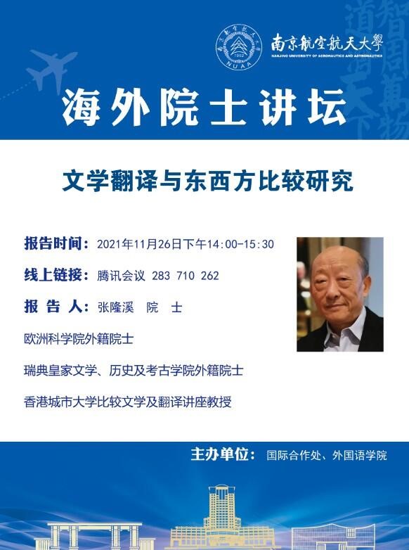 “海外院士讲坛”第六期邀请到了瑞典皇家文学、历史及考古学院外籍院士、欧洲科学院外籍院士、香港城市大学比较文学及翻译讲座张隆溪教授为师生们开讲。世界文学与翻译有什么关系?如何通过翻译打破传统的欧洲中心?中国诗能否翻译成英文?如何处理文学翻译中的具体问题?想必同学们对这些问题的解答已经迫不及待了,讲座将在线上展开,欢迎各位师生莅临参与!
