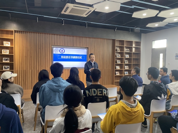 随后长空学院常务副院长蒋彦龙、副院长张林、院长助理王瑞瑒等为27位团队成员颁发劳动责任书。蒋彦龙表示,今天签署这一份责任书,是一份责任,更是一份坚守,希望同学们主动积极劳动,创新创造劳动形式,守好劳动教育职责。保障团队组长李紫萱代表学生发言,她表示接过责任书更感受到肩上的责任,也更有干劲,更有斗志,会带领团队成员做好日常工作,多交流沟通,创新劳动教育形式,时刻保持活力满满,在劳动中进步成长。