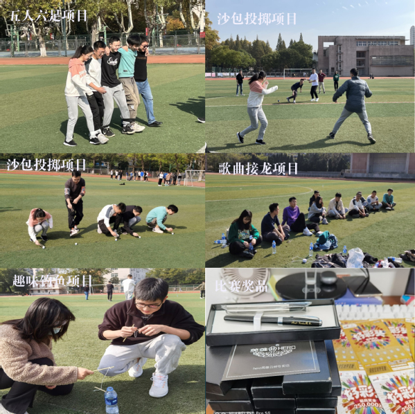 本次趣味运动会安排了五人六足、趣味钓鱼、乒乓接力、沙包投掷和歌曲接龙五个团体项目,团队师生被分为4个小分队进行比赛。比赛现场气氛热烈,团队师生奋勇拼搏展开激烈角逐。伴随着现场此起彼伏的加油声和喝彩声,每个人都享受着趣味运动会带来的快乐。