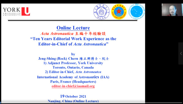 随后,针对写作后如何发表在高水平期刊以及投稿过程中可能出现的问题,团队邀请Acta Astronautica(国际宇航学报)主编、国际宇航科学院院士、加拿大约克大学机械工程系教授Rock Jengshing Chern在线上做了题为“Ten Years Editorial Work Experience as the Editor-in-Chief of Acta Astronautica(Acta Astronautica 主编十年经验谈)”的学术报告。Chern介绍了主讲人从事Acta Astronautica主编11年的经历,漫谈处理过程之经验,以及投稿到Acta Astronautica一般注意事项。报告分为经验案例、Acta Astronautica历史、Acta Astronautica现状以及主讲人在Acta Astronautica的编辑经验与感想。两位教授在报告时结合自己多年的研究经历,与现场听众分享了研究心得和体会。报告结束后,两位教授还与包括金栋平、王在华、陈提等在内的与会老师、学生积极地交流了英文技术性论文撰写和发表过程中的常见问题。通过该科研学习活动,对提高团队师生学术论文的撰写质量和促进团队师生发表高水平期刊论文起到了积极的作用。