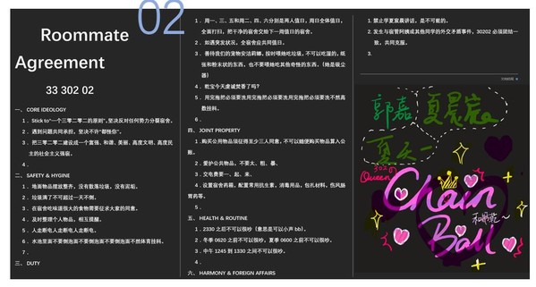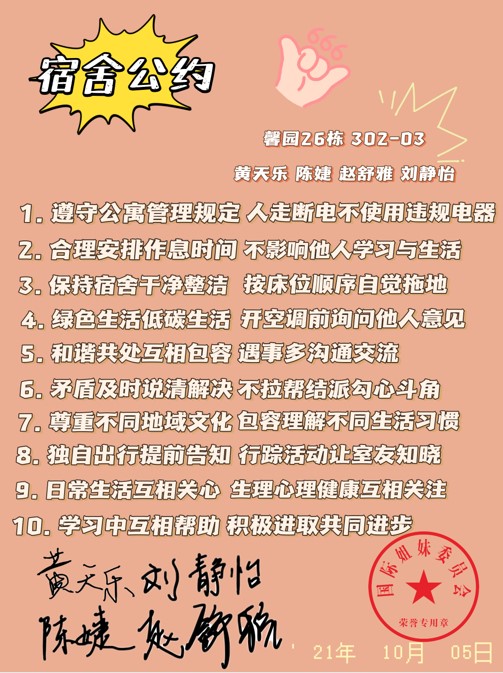 宿舍公约制定活动期间,同一寝室的新生们,一同协商,一同规划,为营造宿舍美好和谐氛围出谋划策,为构建美丽蓝图共同奋斗。合理的公约是文明小寝的第一步,文明小寝的创建需要同学们遵守公约,团结友爱,互帮互助。