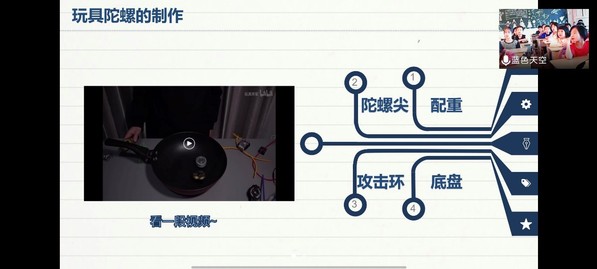 胡家睿分别以玩具陀螺、悠悠球、竹蜻蜓为例,通俗易懂地讲解了陀螺转动原理、轴承工作原理以及伯努利原理。授课小组搜集了大量视频及动图,向小朋友们直观地展示了陀螺转动原理在航天器、机器人、虚拟现实等现代环境下的应用,使小朋友们能更好地理解、掌握授课内容。小朋友们认真听讲,举起小手争先恐后地回答问题,仿佛已经进入奇妙的科学世界。
