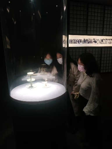 在历史馆中,团队成员跟随一件件精美的展品,感受华夏历史的波澜壮阔。石器时代的展柜前,团员们惊叹于玉文化的源远流长。在隋唐华彩的展厅中,大家沉浸于盛世的煌煌气象。当天展出的国宝汉代错银铜牛灯,线条流畅,飘逸潇洒,并通过巧妙的结构设计,将燃烧产生的烟尘排入灯腹之中,这是中国古人环保观念的体现。从错银铜牛灯,到可持续发展,再到“绿水青山就是金山银山”,环保的理念历久弥新,随着时代车轮滚滚向前,愈益彰显出强大的生命力。