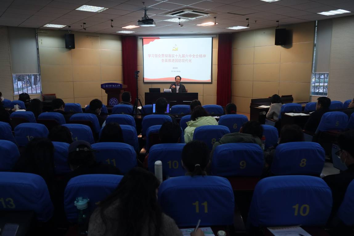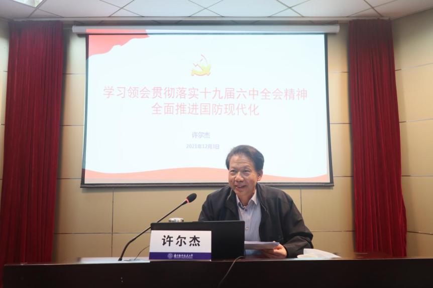 12月3日下午,继续教育学院邀请中国人民解放军少将、原江苏省军区副司令许尔杰将军为大家开展主题为《学习领会贯彻落实十九届六中全会精神全面推进国防现代化》专题宣讲。学院理论学习中心组全体成员、全体教工党员、全体辅导员、学生党员、发展对象和入党积极分子聆听了宣讲。宣讲会在明故宫校区设立了主会场,天目湖校区设立了分会场。