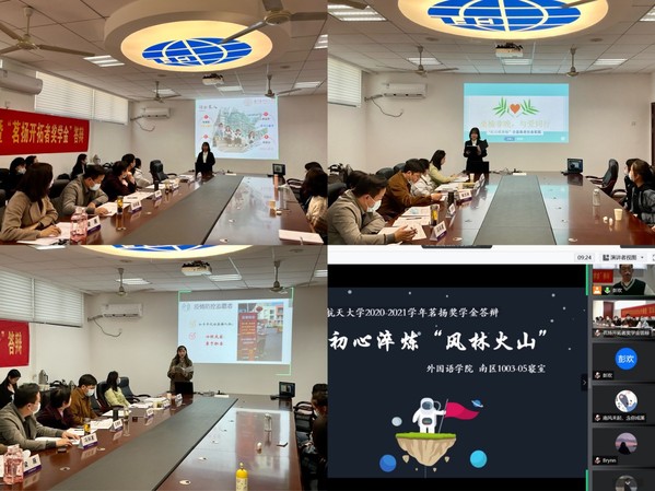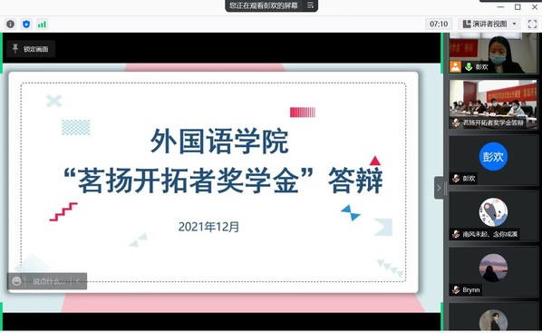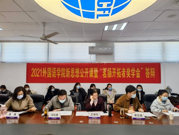 12月2日下午,外国语学院举办了新思想公开课暨“茗扬开拓者奖学金”答辩会。“茗扬开拓者奖学金”资助人杰出院友冯科茗、谢志扬、外国语学院党委副书记梁薇、英语系副教授王晓玲、院团委书记李萍、本科生辅导员盛嘉贤、本科生辅导员彭欢出席答辩会。本次答辩会由上届“茗扬开拓者奖学金”一等奖获得者肖依雪主持,全体本科生通过腾讯会议进行线上观摩学习。