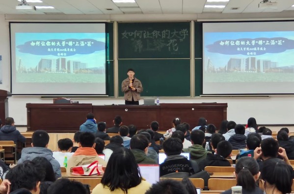 此后,徐伟证分别从愿景导向、目标导向、成果导向三个角度引导和激励同学让自己的大学生活“锦上添花”。他先引用了周恩来总理的例子和王阳明先生的名言展开对愿景导向阐解,并且现场请同学思考和回答你为什么而读书、你想成为什么样的人、你毕业以后想去做什么,旨在明晰同学们学习的初衷与方向。接着他以“有的放矢,持之以恒”为关键词解说目标导向,希望同学们能以愿景为指引,制定目标,规划执行,并持之以恒。